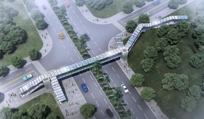 項(xiàng)目規(guī)模:1#人行天橋的橋跨為38m,橋面凈寬3.0m;2#人行天橋的橋跨為42m,橋面凈寬3.0m。